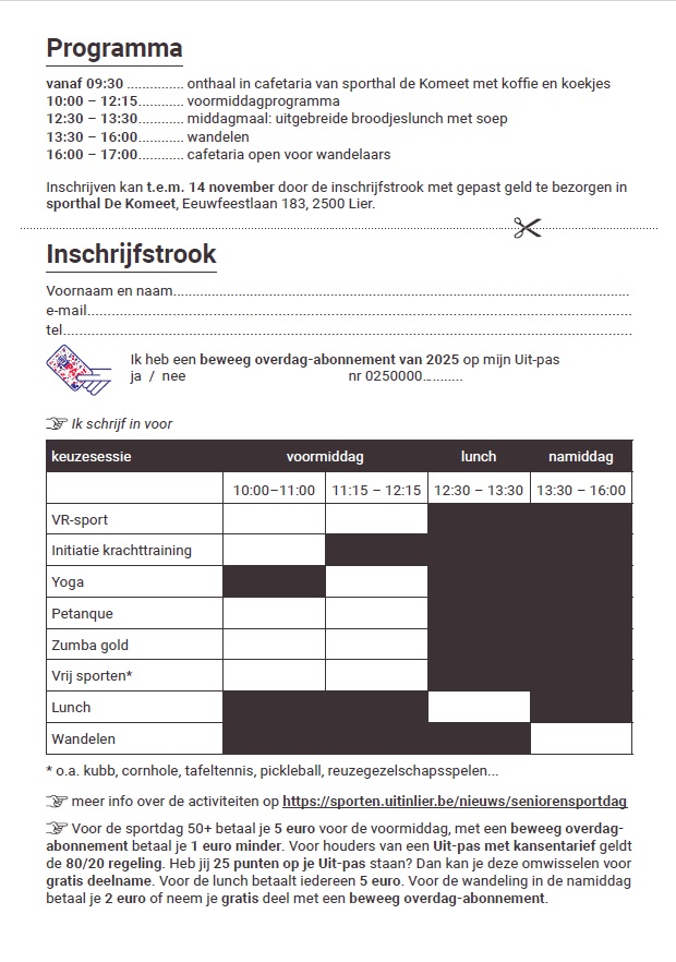Op vrijdag 21 november vindt in sporthal de Komeet de jaarlijkse seniorensportdag plaats. Inschrijven kan tot en met 14 november door jouw inschrijfstrook te bezorgen in sporthal de Komeet.